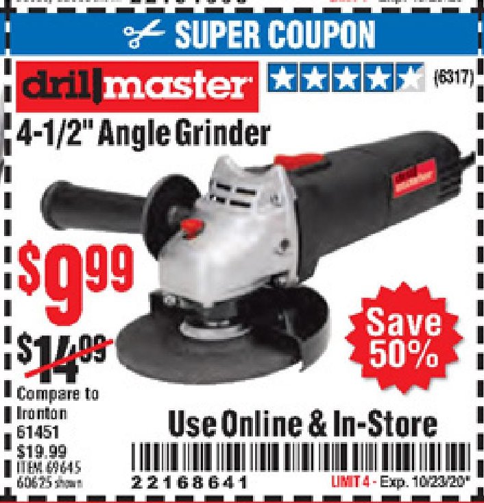 DRILLMASTER 4-1/2" ANGLE GRINDER Lot No. 69645/60625 Expired: 10/23/20 - $9.99 Coupon Code: '22168641'