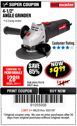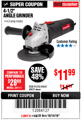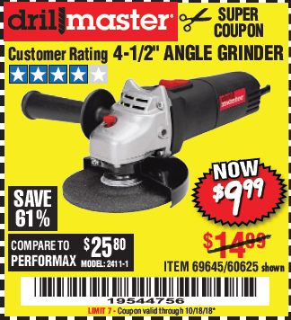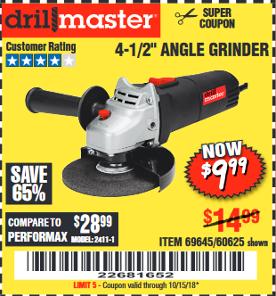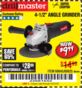 DRILLMASTER 4-1/2" ANGLE GRINDER Lot No. 69645/60625 Expired: 10/21/18 - $9.99 Coupon Code: '91055006'