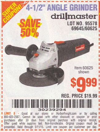 DRILLMASTER 4-1/2" ANGLE GRINDER Lot No. 69645/60625 Expired: 5/11/15 - $9.99 Coupon Code: '30239294'