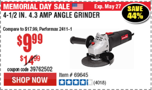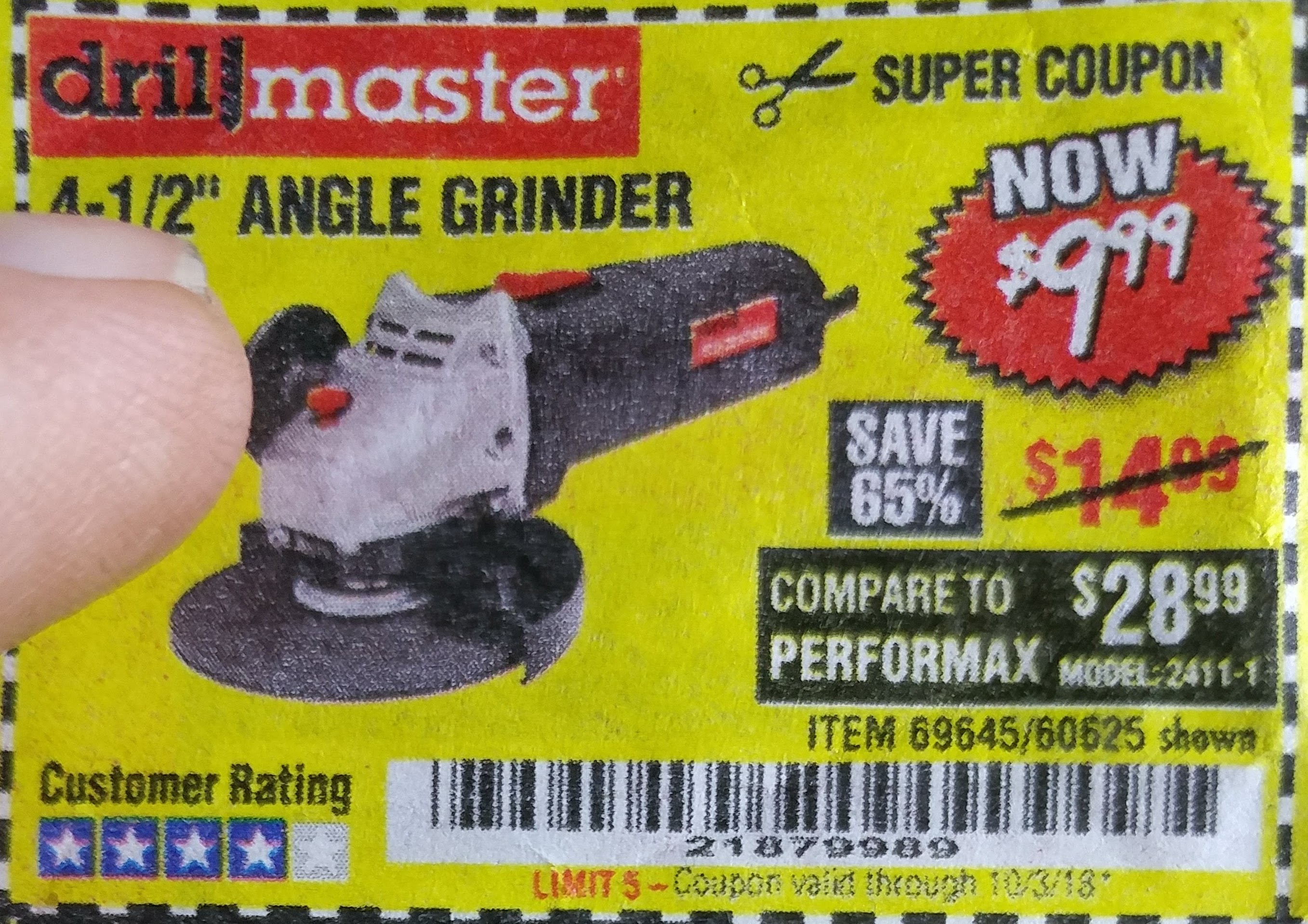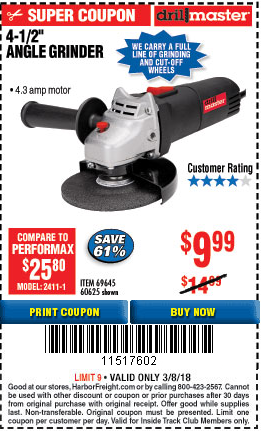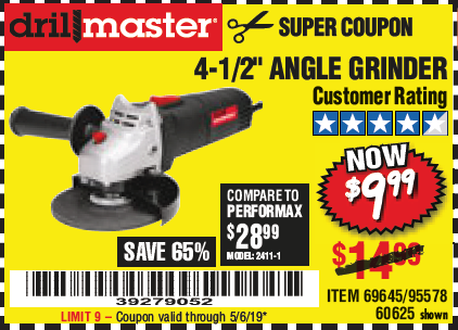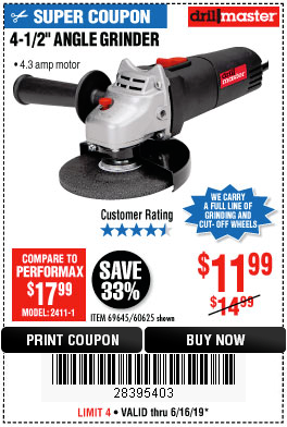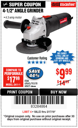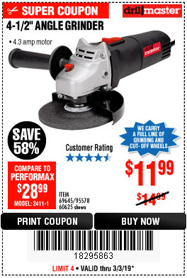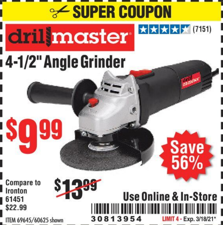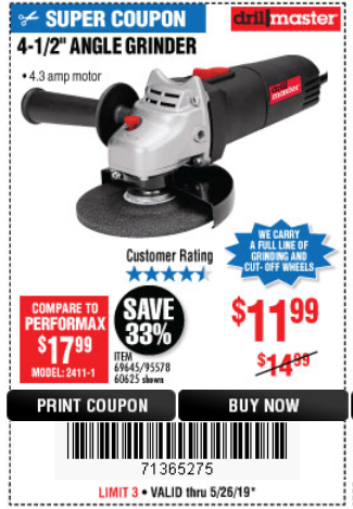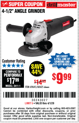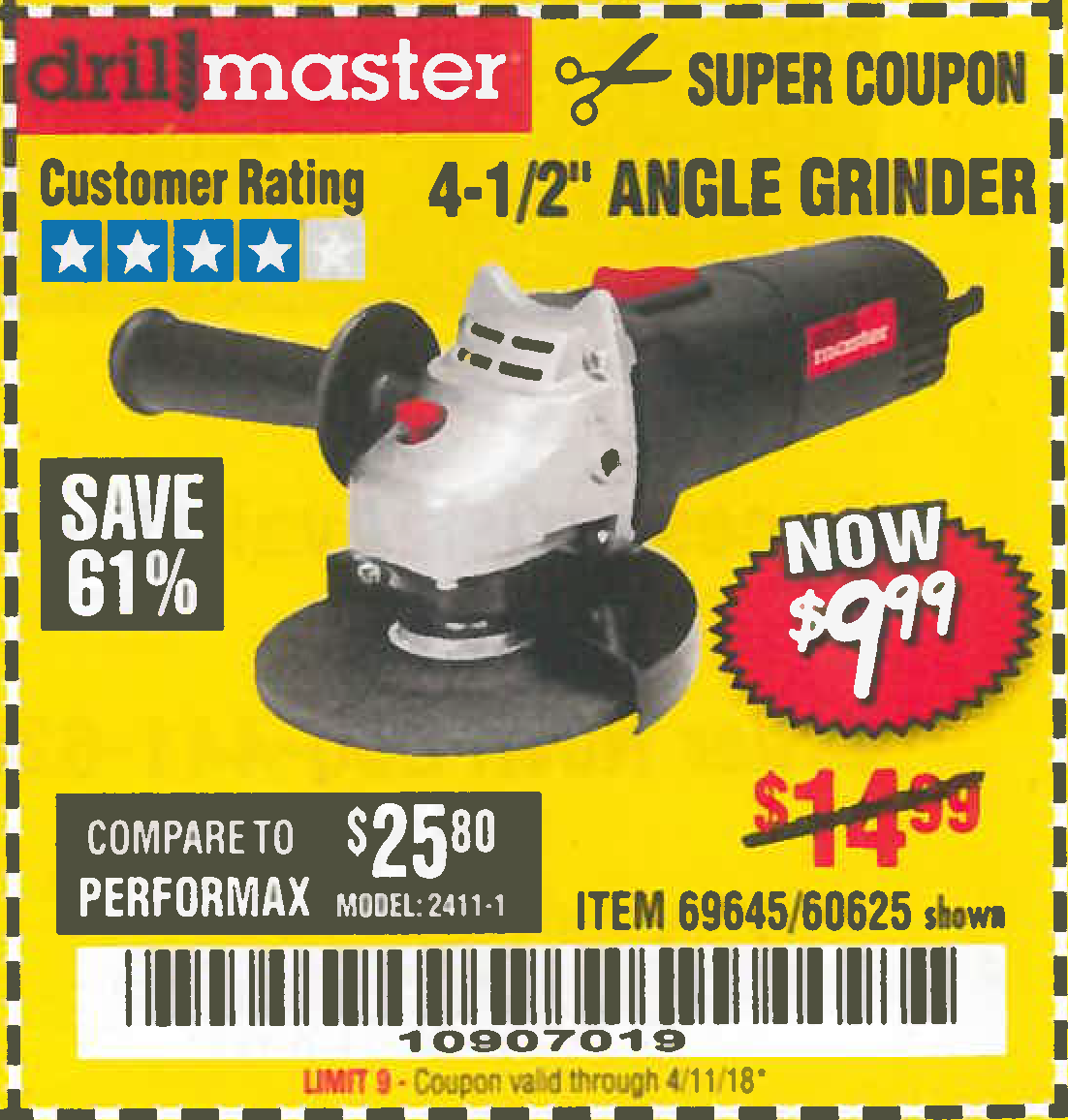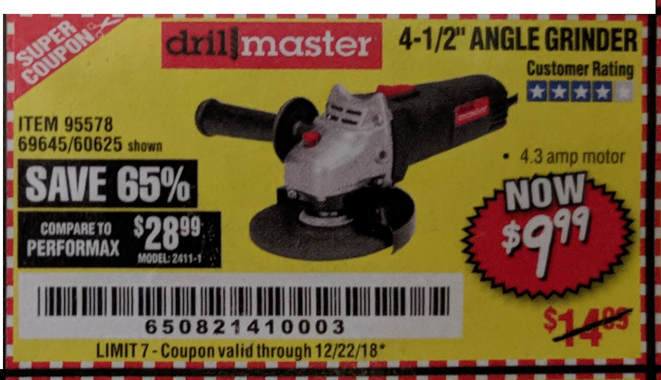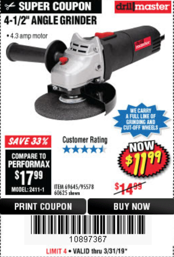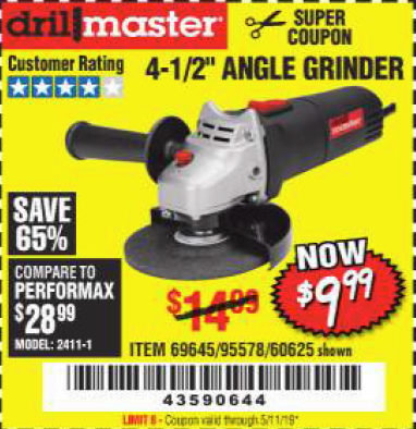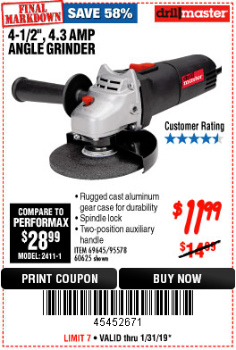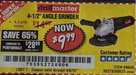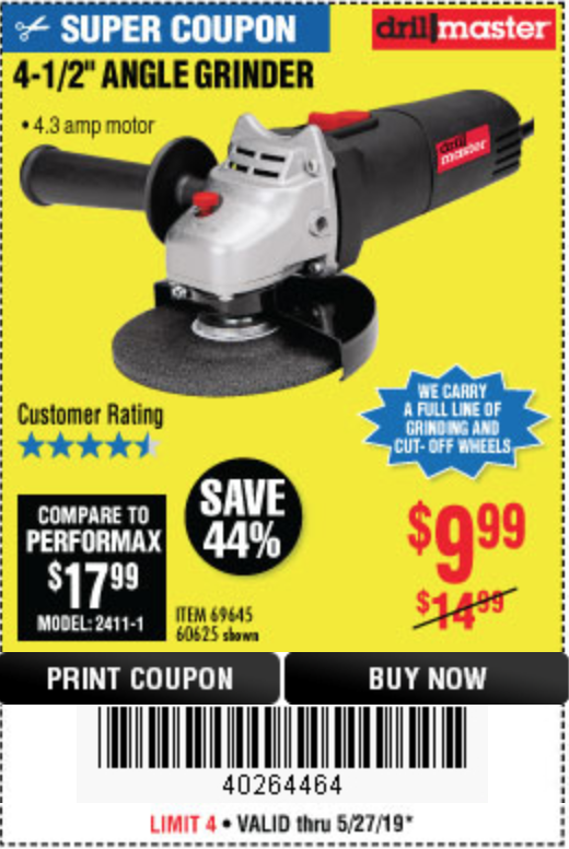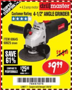 DRILLMASTER 4-1/2" ANGLE GRINDER Lot No. 69645/60625 Expired: 3/31/19 - $11.99 Coupon Code: '10897367'
