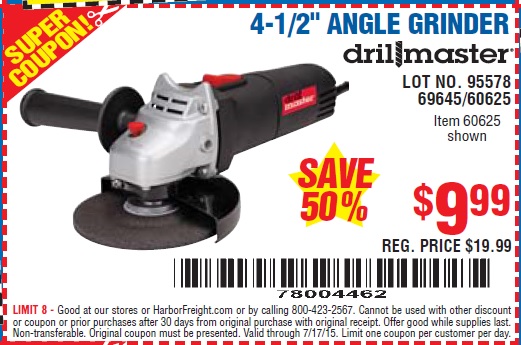 DRILLMASTER 4-1/2" ANGLE GRINDER Lot No. 69645/60625 Expired: 7/17/15 - $9.99 Coupon Code: '78004462'
