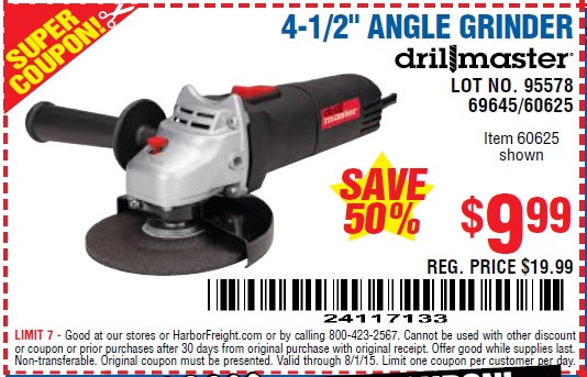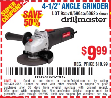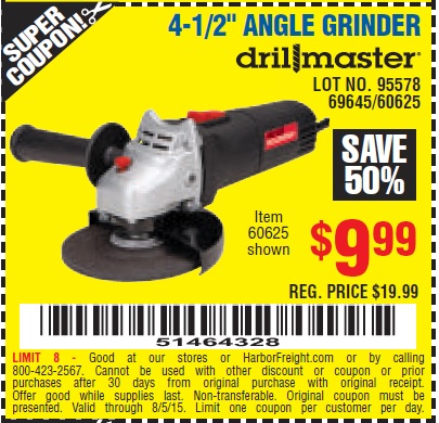 DRILLMASTER 4-1/2" ANGLE GRINDER Lot No. 69645/60625 Expired: 8/1/15 - $9.99 Coupon Code: '24117133'