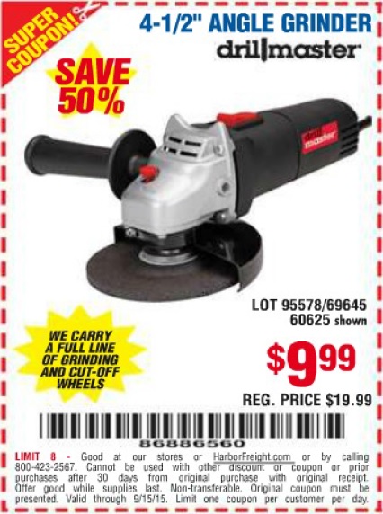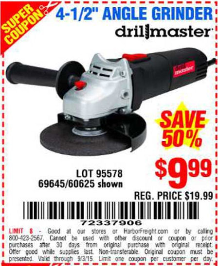 DRILLMASTER 4-1/2" ANGLE GRINDER Lot No. 69645/60625 Expired: 9/15/15 - $9.99 Coupon Code: '86886560'