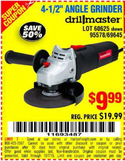 DRILLMASTER 4-1/2" ANGLE GRINDER Lot No. 69645/60625 Expired: 7/2/15 - $9.99 Coupon Code: '32720765'
