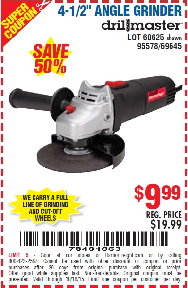 DRILLMASTER 4-1/2" ANGLE GRINDER Lot No. 69645/60625 Expired: 10/16/15 - $9.99 Coupon Code: '78401063'