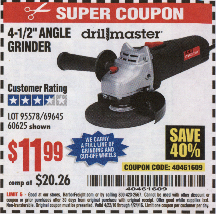 DRILLMASTER 4-1/2" ANGLE GRINDER Lot No. 69645/60625 Expired: 4/24/16 - $11.99 Coupon Code: '40461609'