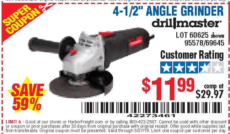 DRILLMASTER 4-1/2" ANGLE GRINDER Lot No. 69645/60625 Expired: 5/27/16 - $11.99 Coupon Code: '42273461'