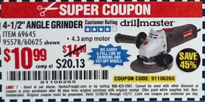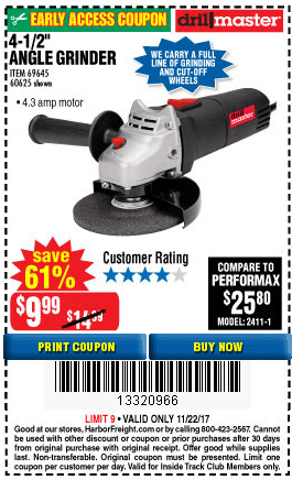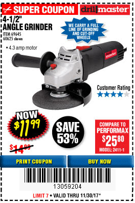 DRILLMASTER 4-1/2" ANGLE GRINDER Lot No. 69645/60625 Expired: 11/30/17 - $11.99 Coupon Code: '13059204'