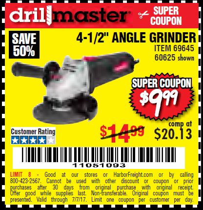 DRILLMASTER 4-1/2" ANGLE GRINDER Lot No. 69645/60625 Expired: 6/21/17 - $9.99 Coupon Code: '99444889'