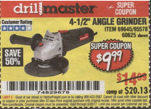 DRILLMASTER 4-1/2" ANGLE GRINDER Lot No. 69645/60625 Expired: 6/26/17 - $9.99 Coupon Code: '74829678'