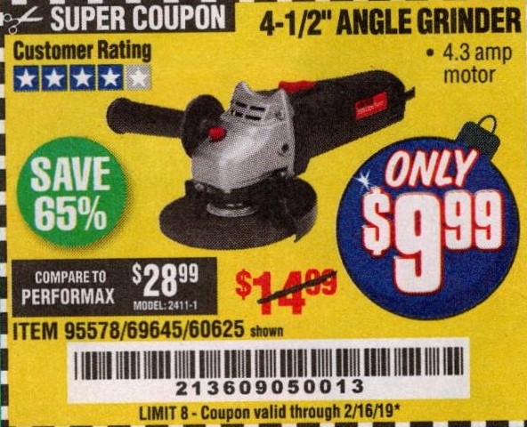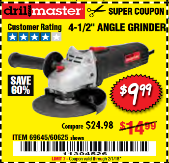 DRILLMASTER 4-1/2" ANGLE GRINDER Lot No. 69645/60625 Expired: 2/16/19 - $9.99 Coupon Code: '21360905'