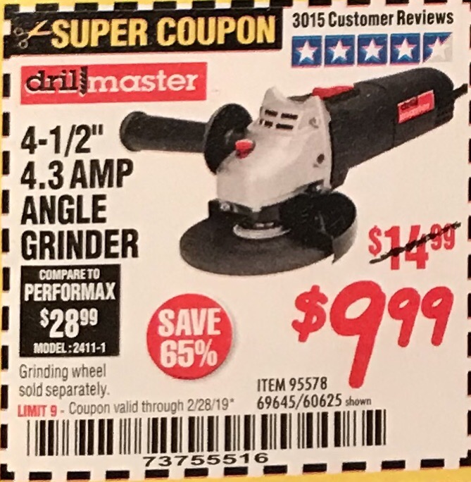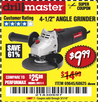 DRILLMASTER 4-1/2" ANGLE GRINDER Lot No. 69645/60625 Expired: 2/28/19 - $9.99 Coupon Code: '73755516'