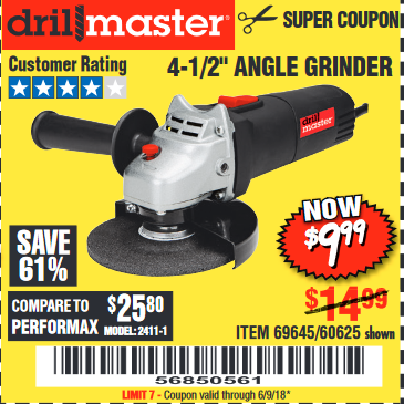 DRILLMASTER 4-1/2" ANGLE GRINDER Lot No. 69645/60625 Expired: 6/9/18 - $9.99 Coupon Code: '56850561'