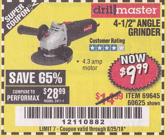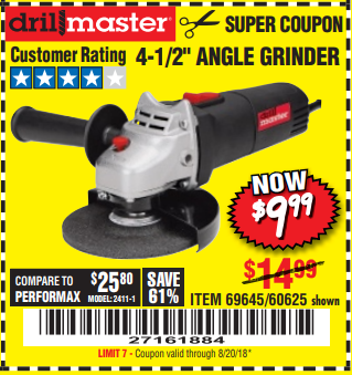 DRILLMASTER 4-1/2" ANGLE GRINDER Lot No. 69645/60625 Expired: 8/25/18 - $9.99 Coupon Code: '12110882'