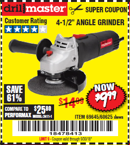DRILLMASTER 4-1/2" ANGLE GRINDER Lot No. 69645/60625 Expired: 9/30/18 - $9.99 Coupon Code: '18478413'