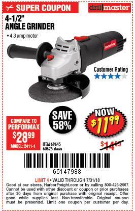 DRILLMASTER 4-1/2" ANGLE GRINDER Lot No. 69645/60625 Expired: 7/31/18 - $11.99 Coupon Code: '65147988'