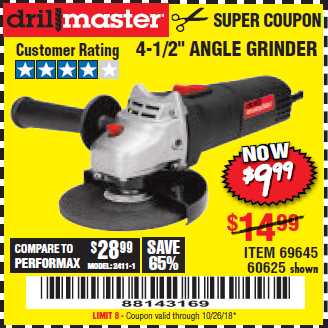 DRILLMASTER 4-1/2" ANGLE GRINDER Lot No. 69645/60625 Expired: 10/26/18 - $9.99 Coupon Code: '88143169'
