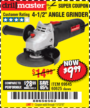 DRILLMASTER 4-1/2" ANGLE GRINDER Lot No. 69645/60625 Expired: 11/16/18 - $9.99 Coupon Code: '88656563'