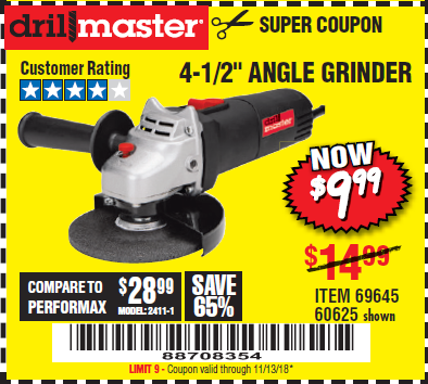 DRILLMASTER 4-1/2" ANGLE GRINDER Lot No. 69645/60625 Expired: 11/13/18 - $9.99 Coupon Code: '88708354'