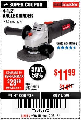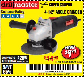 DRILLMASTER 4-1/2" ANGLE GRINDER Lot No. 69645/60625 Expired: 12/2/18 - $9.99 Coupon Code: '66863183'
