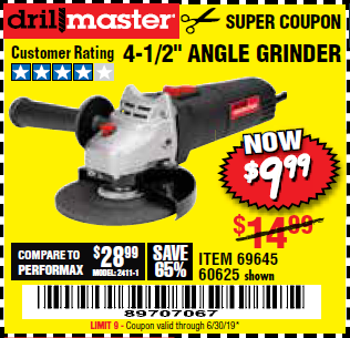 DRILLMASTER 4-1/2" ANGLE GRINDER Lot No. 69645/60625 Expired: 6/30/19 - $9.99 Coupon Code: '89707067'