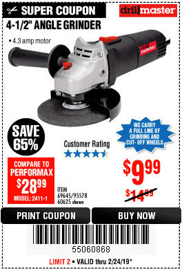 DRILLMASTER 4-1/2" ANGLE GRINDER Lot No. 69645/60625 Expired: 2/24/19 - $9.99 Coupon Code: '55060868'