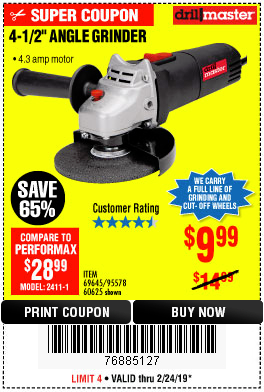 DRILLMASTER 4-1/2" ANGLE GRINDER Lot No. 69645/60625 Expired: 2/24/19 - $9.99 Coupon Code: '76885127'