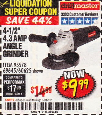 DRILLMASTER 4-1/2" ANGLE GRINDER Lot No. 69645/60625 Expired: 5/31/19 - $9.99 Coupon Code: '96175468'