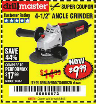 DRILLMASTER 4-1/2" ANGLE GRINDER Lot No. 69645/60625 Expired: 8/5/15 - $9.99 Coupon Code: '51464328'