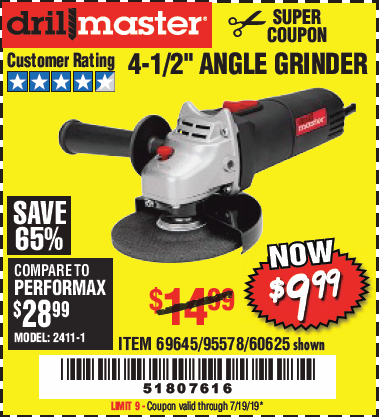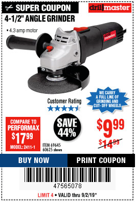 DRILLMASTER 4-1/2" ANGLE GRINDER Lot No. 69645/60625 Expired: 7/19/19 - $9.99 Coupon Code: '51807616'