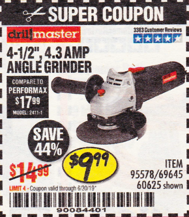 DRILLMASTER 4-1/2" ANGLE GRINDER Lot No. 69645/60625 Expired: 6/30/19 - $9.99 Coupon Code: '90084401'