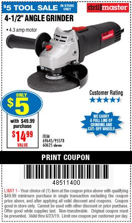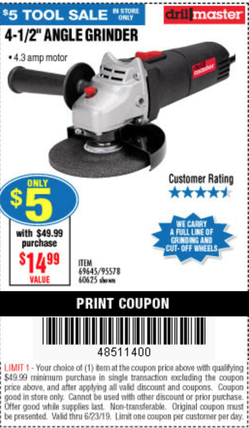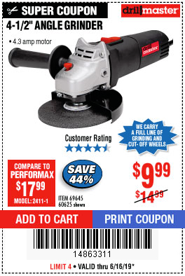 DRILLMASTER 4-1/2" ANGLE GRINDER Lot No. 69645/60625 Expired: 6/5/19 - $9.99 Coupon Code: '56086872'