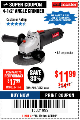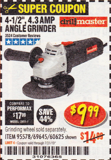 DRILLMASTER 4-1/2" ANGLE GRINDER Lot No. 69645/60625 Expired: 7/31/19 - $9.99 Coupon Code: '31076365'