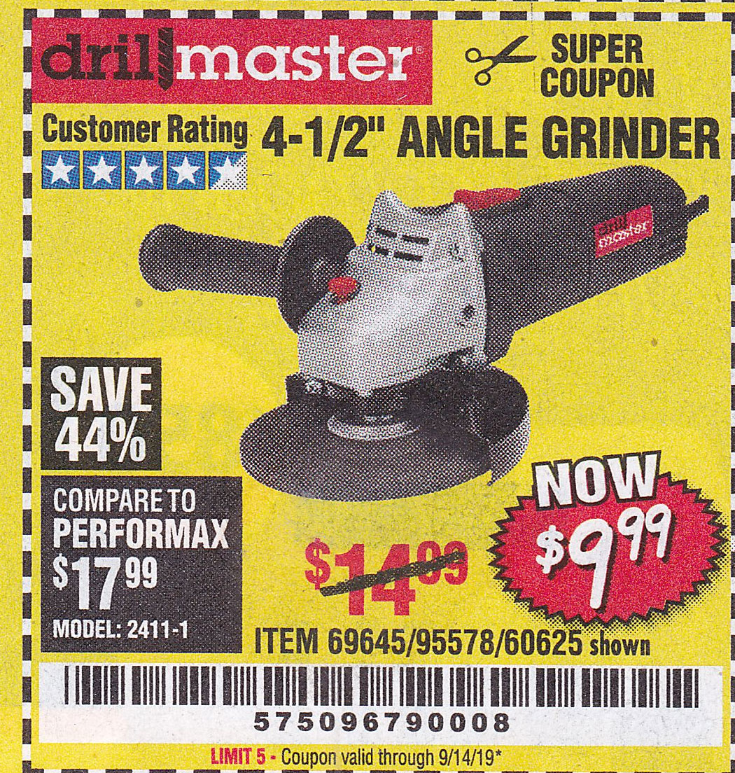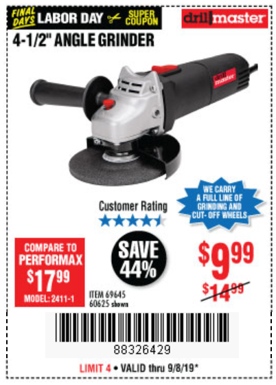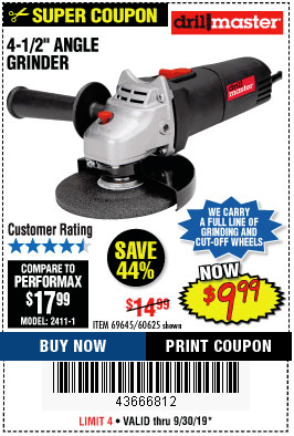 DRILLMASTER 4-1/2" ANGLE GRINDER Lot No. 69645/60625 Expired: 9/8/19 - $9.99 Coupon Code: '88326429'