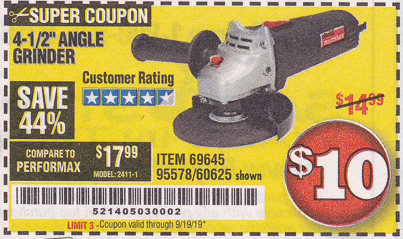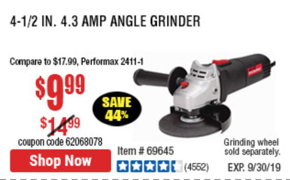 DRILLMASTER 4-1/2" ANGLE GRINDER Lot No. 69645/60625 Expired: 9/14/19 - $9.99 Coupon Code: '57509679'