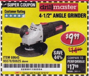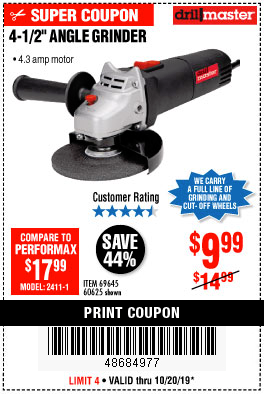 DRILLMASTER 4-1/2" ANGLE GRINDER Lot No. 69645/60625 Expired: 10/20/19 - $9.99 Coupon Code: '48684977'