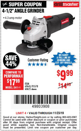 DRILLMASTER 4-1/2" ANGLE GRINDER Lot No. 69645/60625 Expired: 11/23/19 - $9.99 Coupon Code: '49803908'