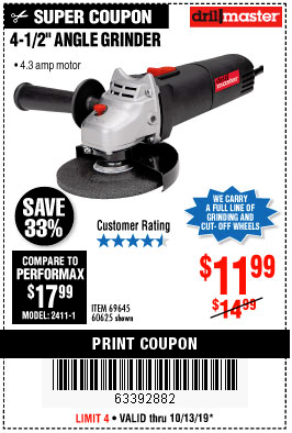 DRILLMASTER 4-1/2" ANGLE GRINDER Lot No. 69645/60625 Expired: 10/13/19 - $11.99 Coupon Code: '63392882'