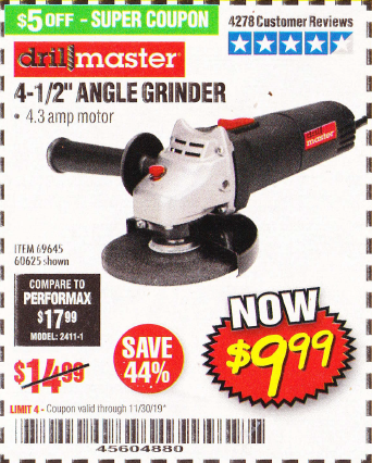 DRILLMASTER 4-1/2" ANGLE GRINDER Lot No. 69645/60625 Expired: 11/30/19 - $9.99 Coupon Code: '45604880'
