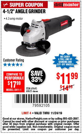 DRILLMASTER 4-1/2" ANGLE GRINDER Lot No. 69645/60625 Expired: 11/24/19 - $11.99 Coupon Code: '79592105'