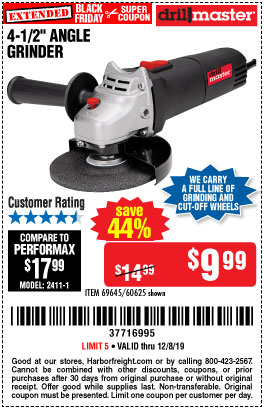 DRILLMASTER 4-1/2" ANGLE GRINDER Lot No. 69645/60625 Expired: 12/8/19 - $9.99 Coupon Code: '37716995'