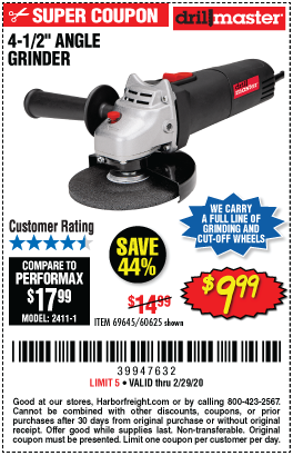 DRILLMASTER 4-1/2" ANGLE GRINDER Lot No. 69645/60625 Expired: 2/29/20 - $9.99 Coupon Code: '39947632'