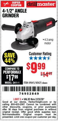 DRILLMASTER 4-1/2" ANGLE GRINDER Lot No. 69645/60625 Expired: 2/23/20 - $9.99 Coupon Code: '76952849'