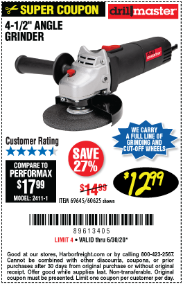DRILLMASTER 4-1/2" ANGLE GRINDER Lot No. 69645/60625 Expired: 6/30/20 - $12.99 Coupon Code: '89613405'