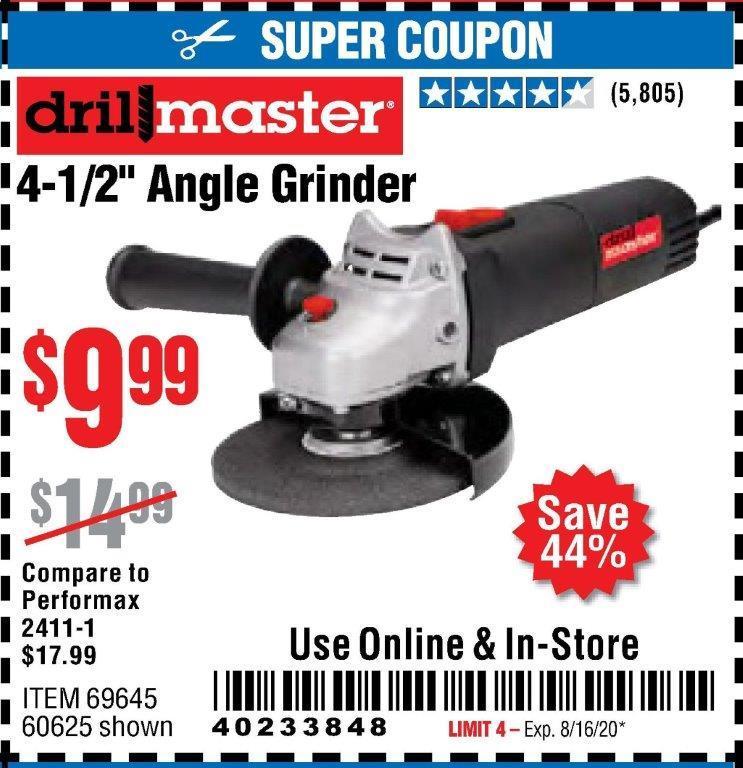 DRILLMASTER 4-1/2" ANGLE GRINDER Lot No. 69645/60625 Expired: 7/31/20 - $9.99 Coupon Code: '74386855'