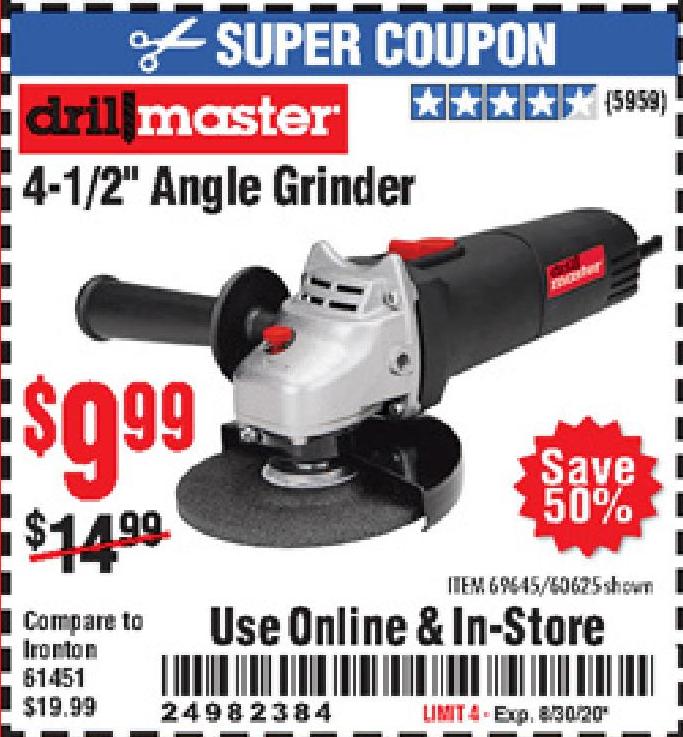 DRILLMASTER 4-1/2" ANGLE GRINDER Lot No. 69645/60625 Expired: 8/30/20 - $9.99 Coupon Code: '24982384'
