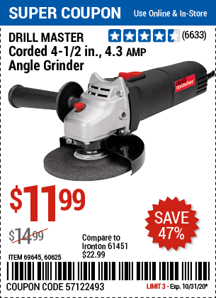 DRILLMASTER 4-1/2" ANGLE GRINDER Lot No. 69645/60625 Expired: 10/31/20 - $11.99 Coupon Code: '57122493'