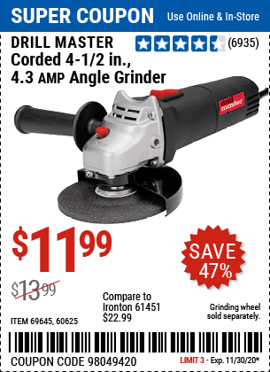 DRILLMASTER 4-1/2" ANGLE GRINDER Lot No. 69645/60625 Expired: 11/30/20 - $11.99 Coupon Code: '98049420'
