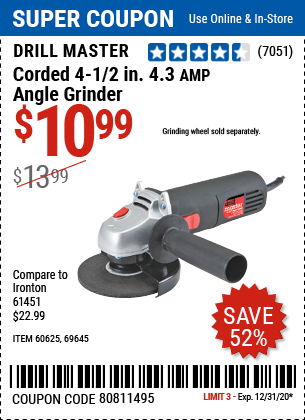 DRILLMASTER 4-1/2" ANGLE GRINDER Lot No. 69645/60625 Expired: 12/31/20 - $10.99 Coupon Code: '80811495'