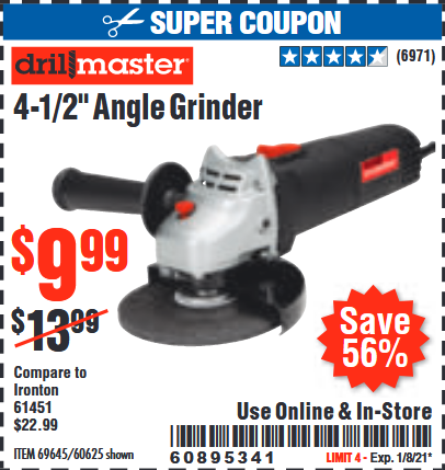 DRILLMASTER 4-1/2" ANGLE GRINDER Lot No. 69645/60625 Expired: 1/8/21 - $9.99 Coupon Code: '60895341'